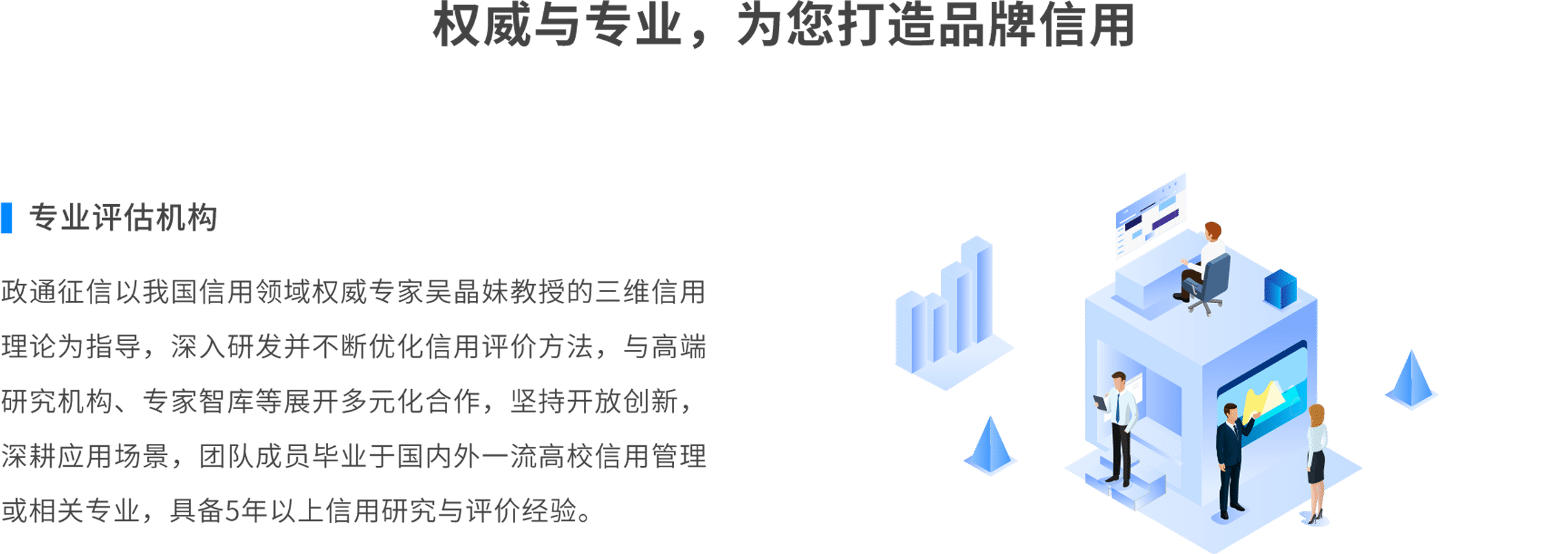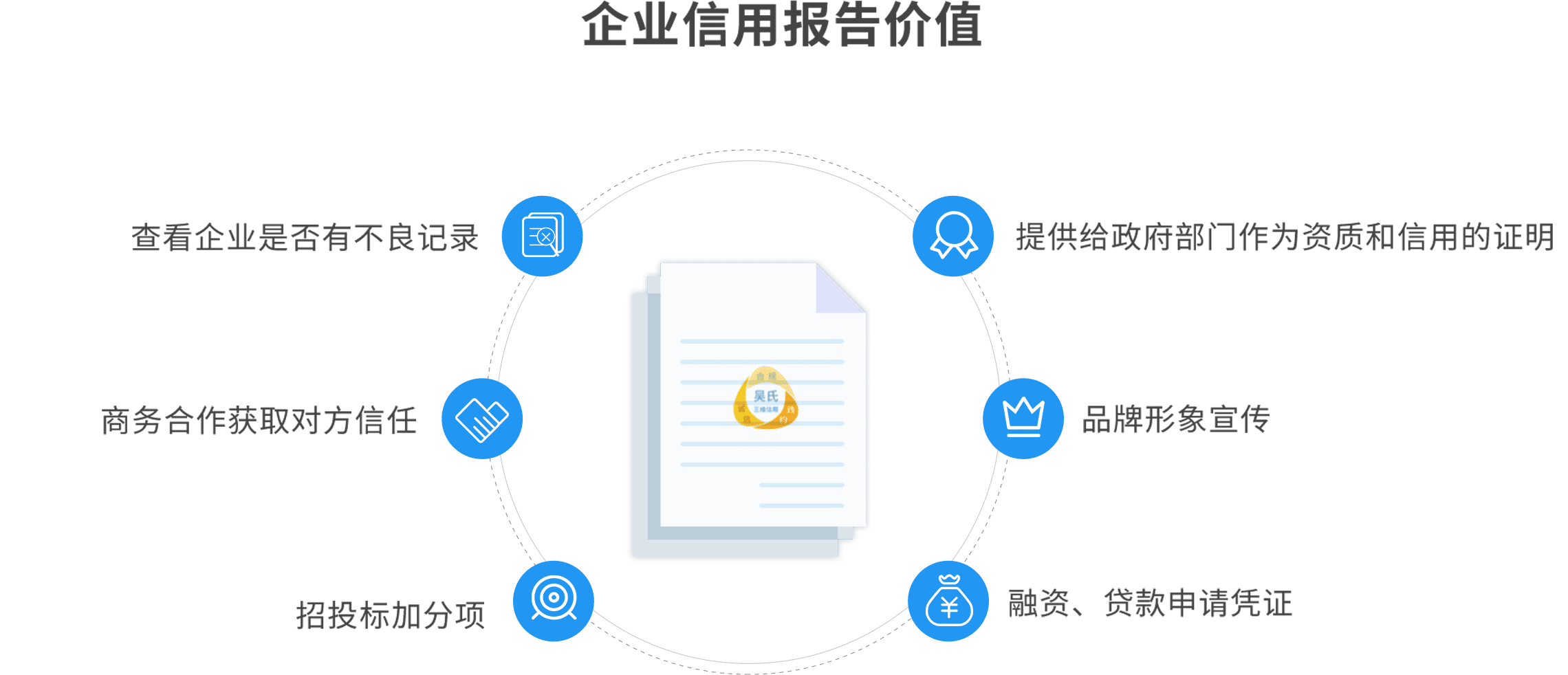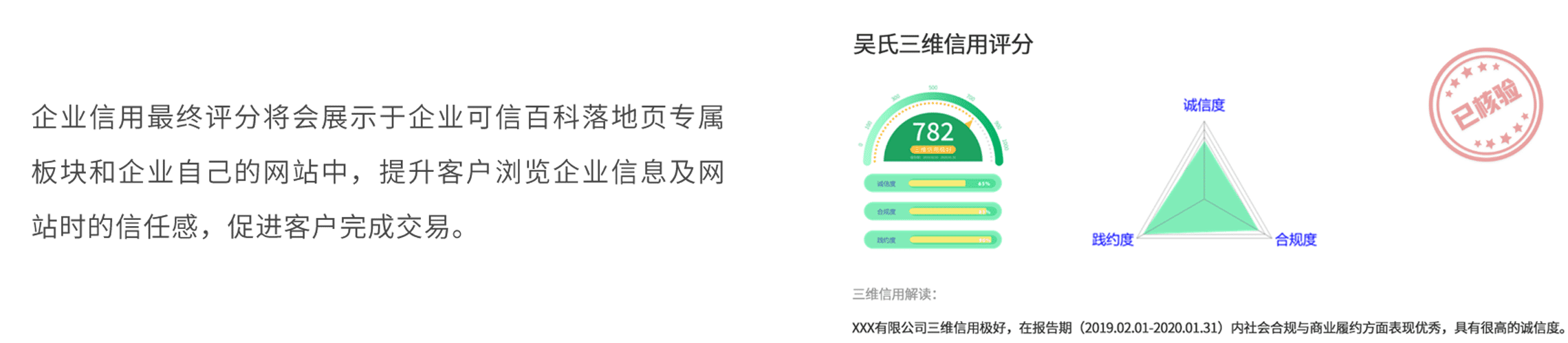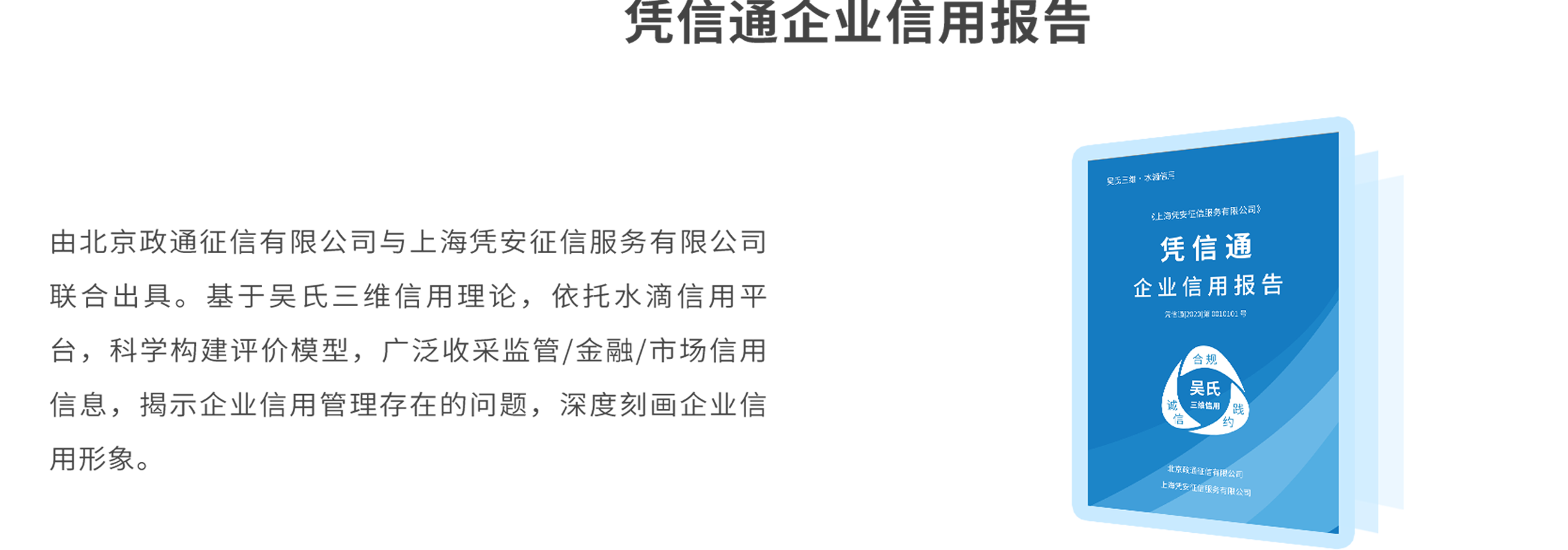 三分钟填写测评问卷,免费获取吴氏三维信用分,了解并管理自己企业的信用;更可购买凭信通企业信用报告,获得权威信用认证,秀出好信用,交易更畅通。